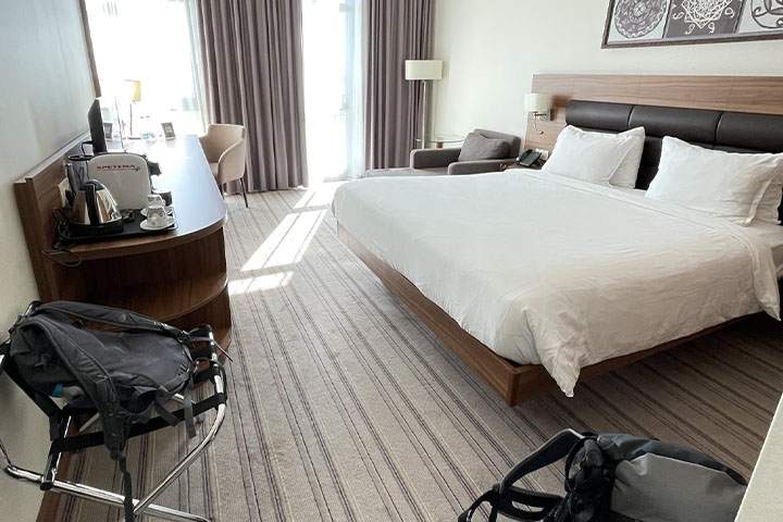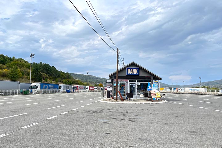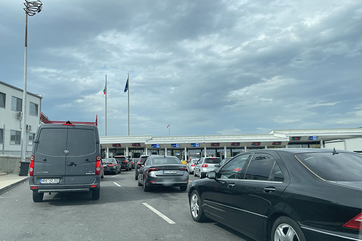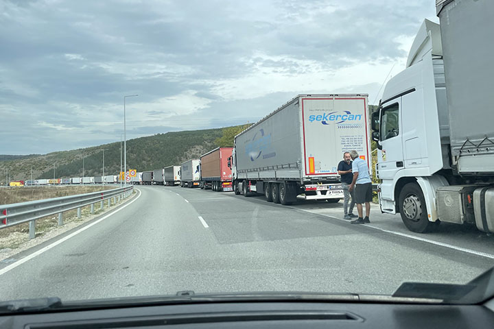 右のレーンでは、トルコからヨーロッパへの輸出品を運ぶトレーラーが貨物検査を受けるために並んで待っている。