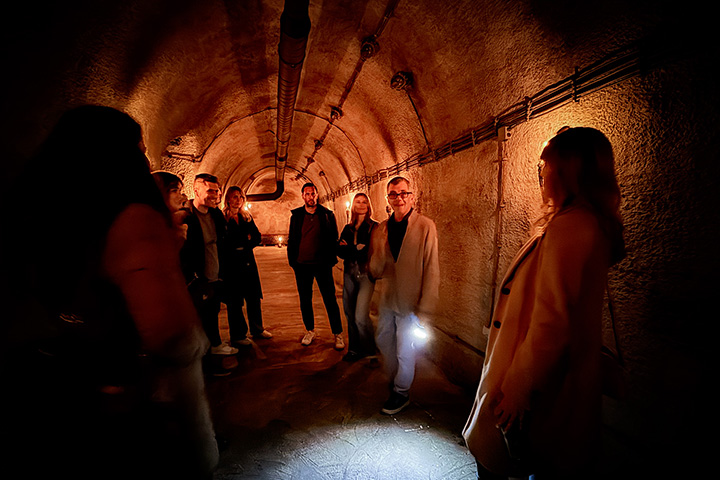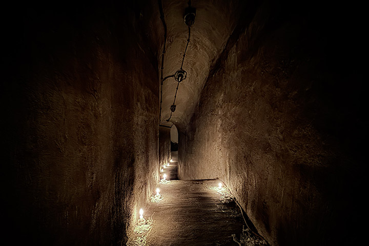 ゆるやかな坂を下りると、地下17メートル地点のテイスティングルームに到着。